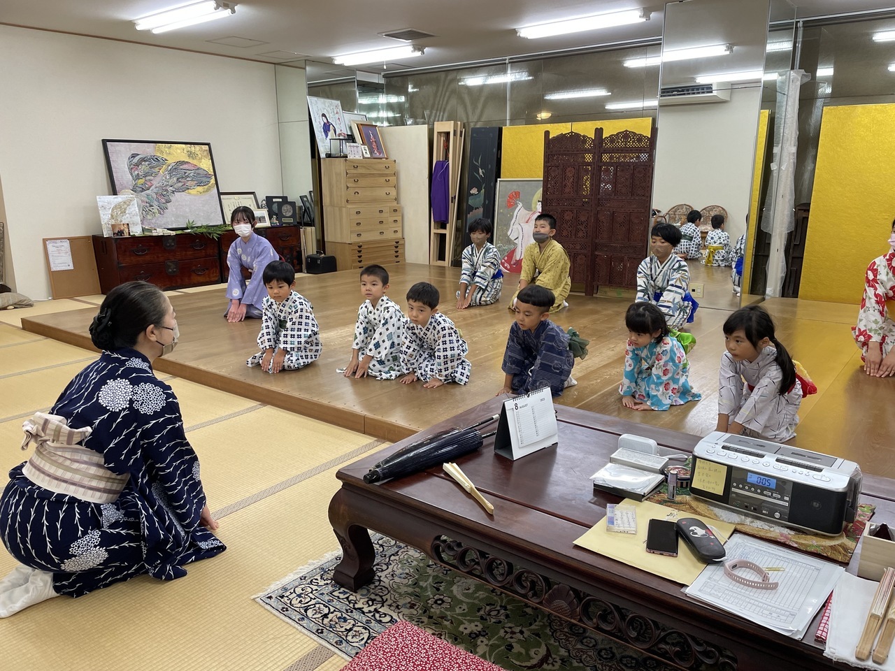夏休み期間に開かれる、こども教室の様子です。お稽古場はご覧のように檜舞台となっており、床踏みも足を傷めずしっかりお稽古できます。時には、外のイベントに参加したり、オリンパス大ホール(現J-COMホール)での発表の機会もありました。男の子も大勢いますよ!